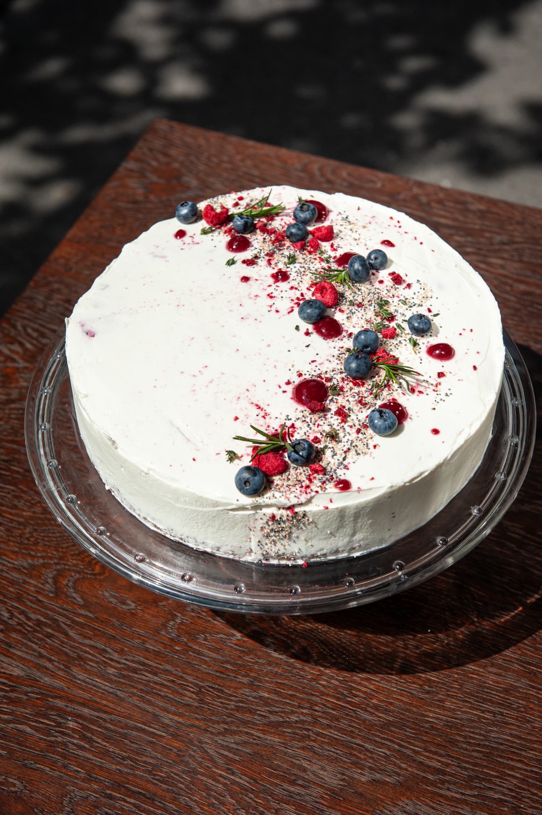 Gluten-free poppy seed sponge cake with soft cheese cream and fresh raspberries, covered with a layer of mascarpone cream.
