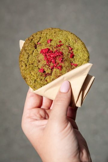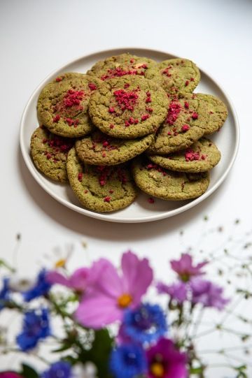 Butter matcha cookies with white chocolate and dried raspberries. We can prepare any quantity of cookies according to your wishes, just write it to us in the note.