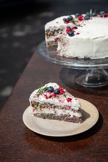Poppy seed cake with cheese cream and raspberries