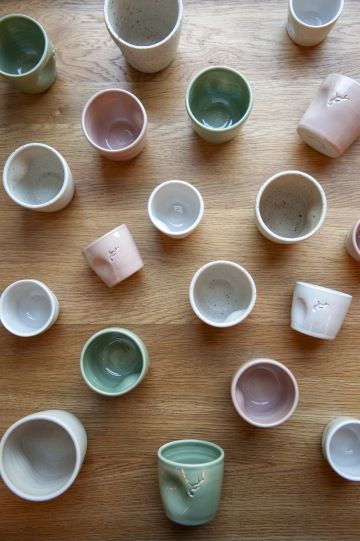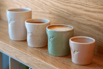 Our dear ceramist Martin Poš made beautiful mugs and cups with handles in several glazes. In addition to enjoying coffee or tea in them at our cafes, you can buy them to bring joy to your home or as a nice gift for your loved ones. Each mug is a handmade original and perfectly imperfect. We have them in 4 sizes - espresso, cappuccino, latte, or a large one with a handle for tea and other hot drinks.